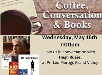 This event will be held at the Perked Pierogi in Grand Valley feauring mystery/crime author Hugh Russel. Enjoy a warm beverage and snack as you listen to Hugh talk about his books and his writing process.