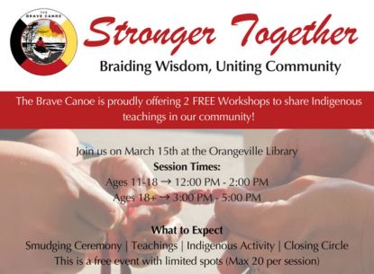 The Brave Canoe in partnership with the Dufferin Community Foundation and Orangeville Public Library offer this special community gathering open to Indigenous and non-Indigenous participants. These sessions will be a chance to learn, connect, and experience traditional teachings in a welcoming space.