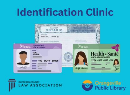 Do you need to replace or obtain legal Canadian identification? The Dufferin County Law Association in partnership with the Library is hosting an Identification Clinic at the Mill Street location on Friday, November 7 from 4:30 to 6 p.m. This is a drop in program.